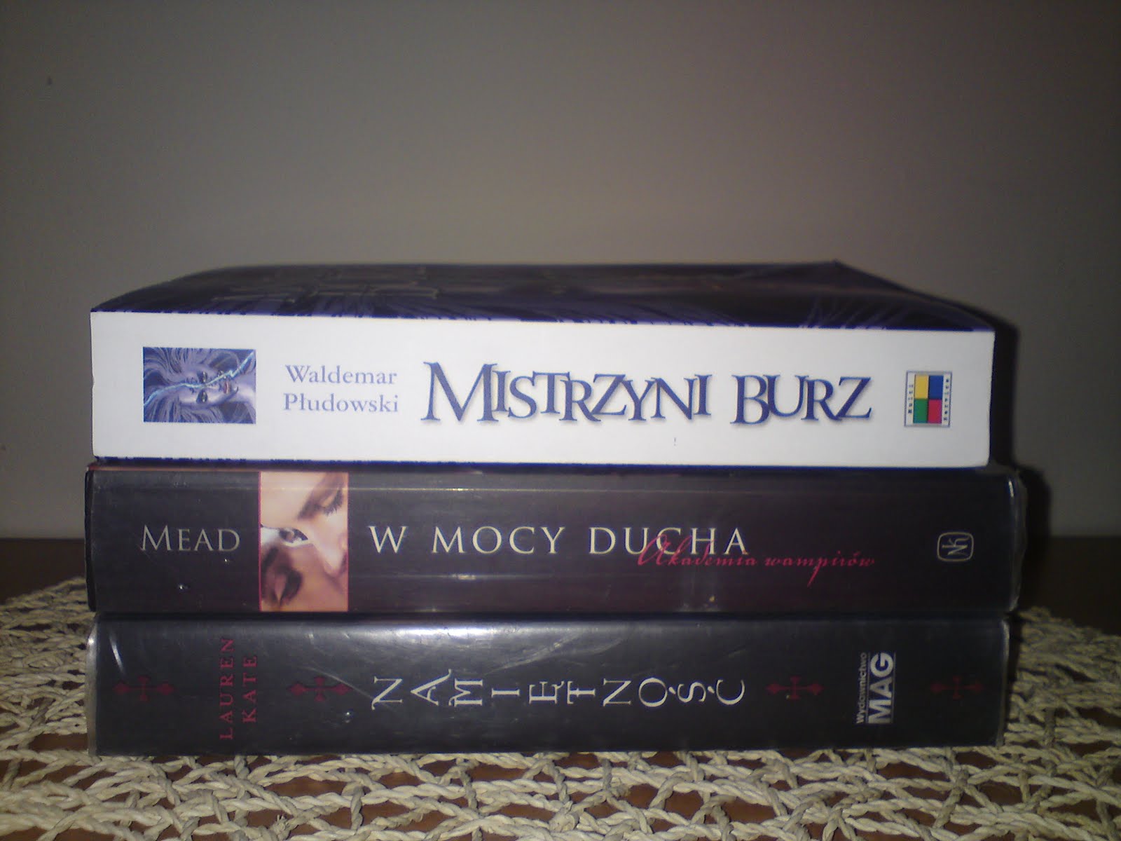 Jak widać ta pierwsza książka nie jest z biblioteki, a od autora. Zaskoczyła, a zarazem ucieszyła mnie wiadomość od pana Waldemara Płudowskiego, z zapytaniem czy byłabym chętna na zrecenzowanie tej książki. Oczywiście od razu się zgodziłam, ponieważ od dawna bardzo jestem jej ciekawa, a niestety w mojej bibliotece jej nie ma. Jestem w trakcie czytania tej książki i myślę, że w tym tygodniu już ją skończę, a co za tym idzie od razu ukaże się recenzja. Jeśli chodzi zaś o “Akademię Wampirów” to niestety będę musiała jeszcze poczekać na “Przysięgę krwi”, ale cóż… Co czytać mam, więc nie narzekam, ale mam nadzieję, że przyjdzie dosyć szybko, bo już od dawna pragnę przeczytać kolejne części tej serii. Wiem, stosik do wiekich i bogatych nie należy, ale ja jestem z niego bardzo zadowolona, bo nie liczy się ilość, ale jakość. 😀